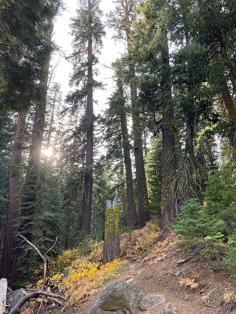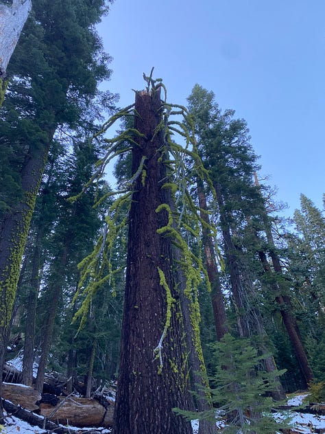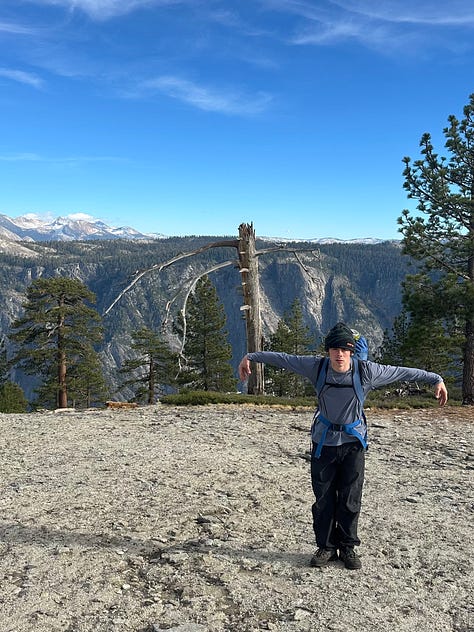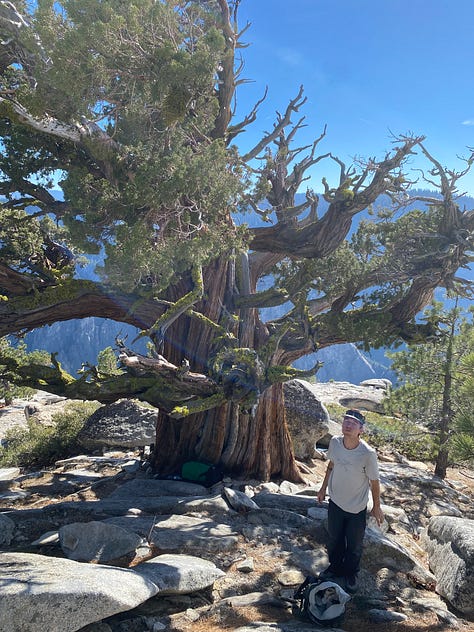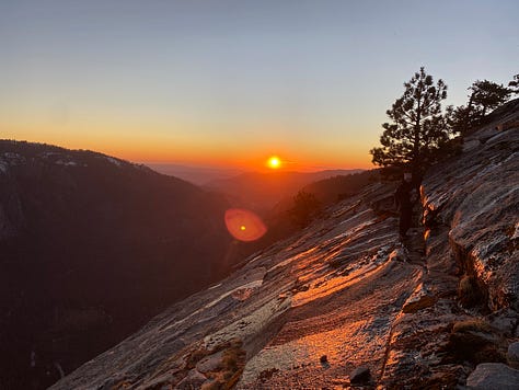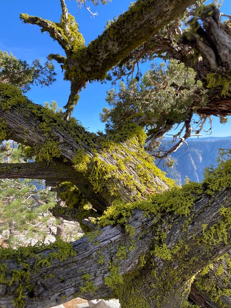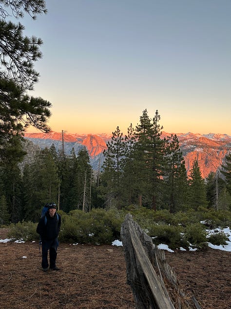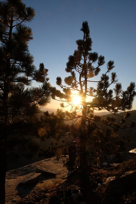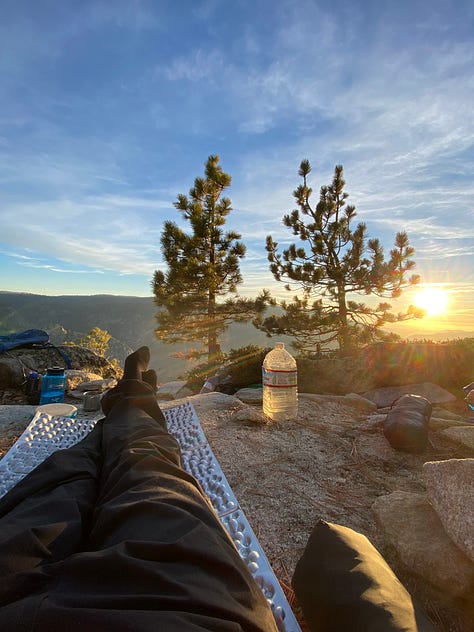 The experience of rappelling in from the top of El Cap is also pretty exceptional. I’m glad we had a ground-up day first, but being up on the headwall—essentially cragging—is really cool. Most of the upper pitches would be classic single pitches on the ground. We would usually spend the morning working out two or three pitches before the sun came around, then jumar back out and hang out on top for the rest of the day. Spending time on the summit has brought some of my favourite moments from the trip; the landscape up there is truly magical. Although the valley floor can seem a bit like a show at times, up top, you're far removed and set in some of the best scenery I’ve seen. I loved the 30-minute hike to the spring to collect water, where we would walk past all the gnarled trees, weathered by wind and lightning strikes, then through a mossy forest dappled in pink evening light.