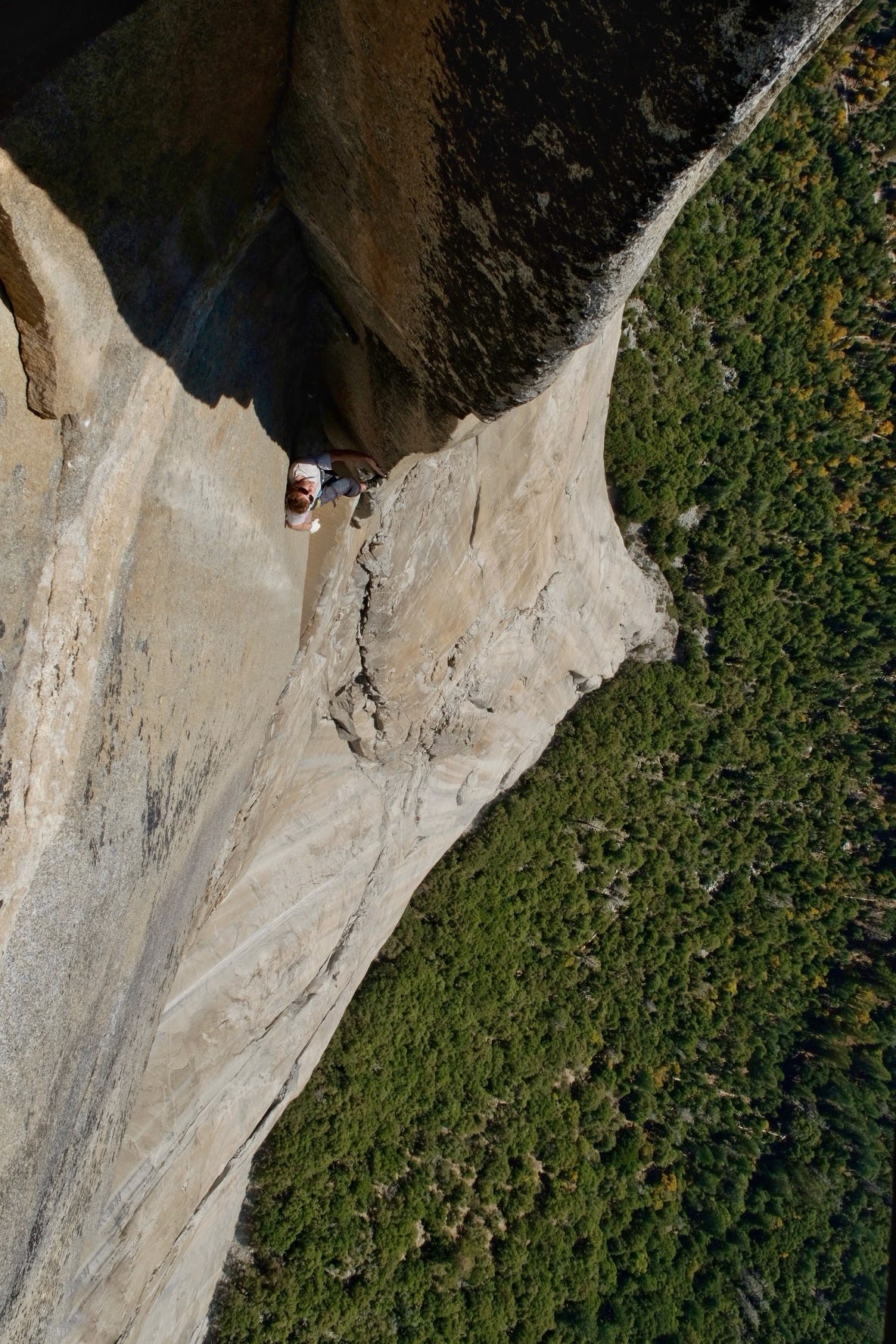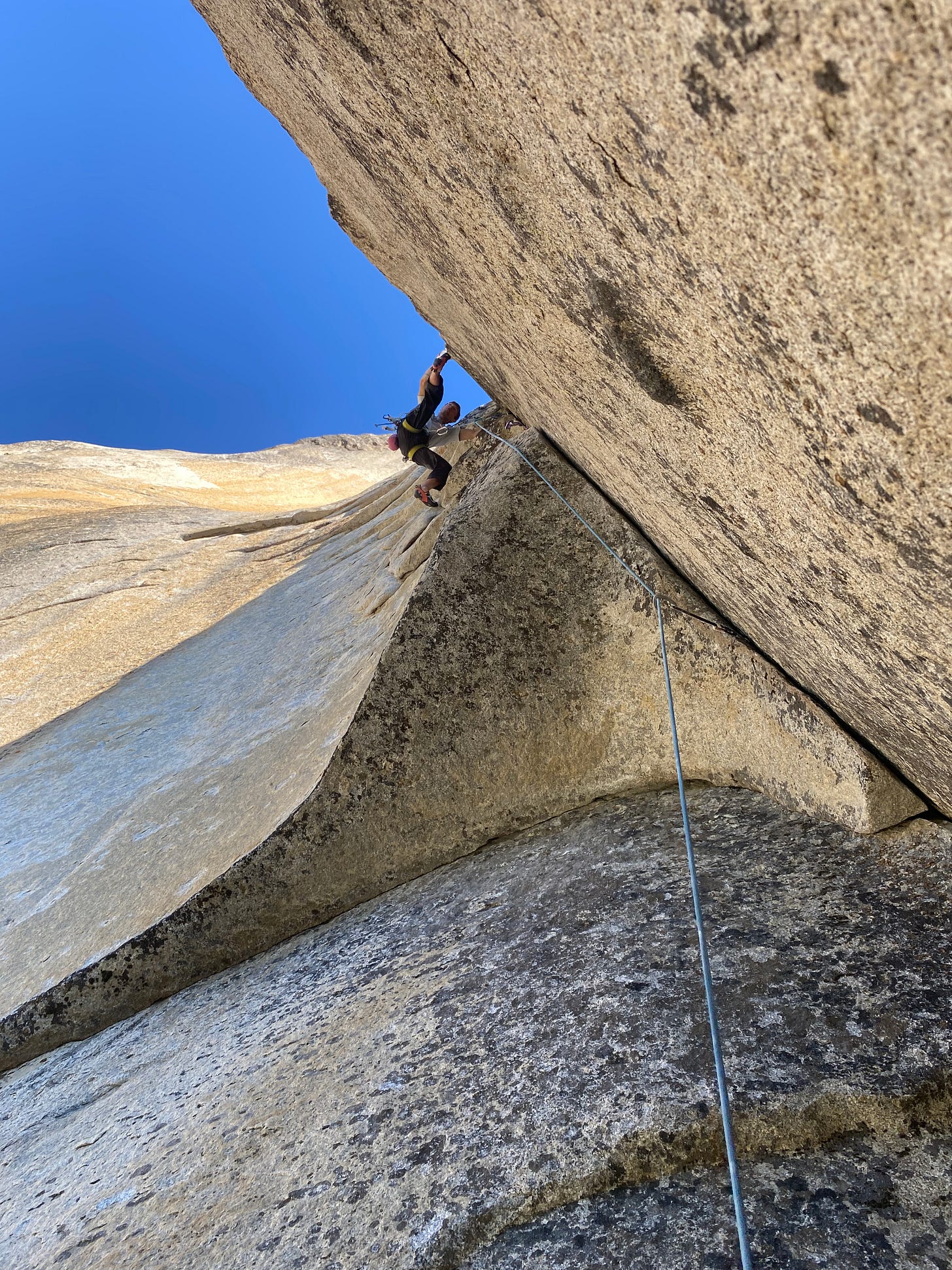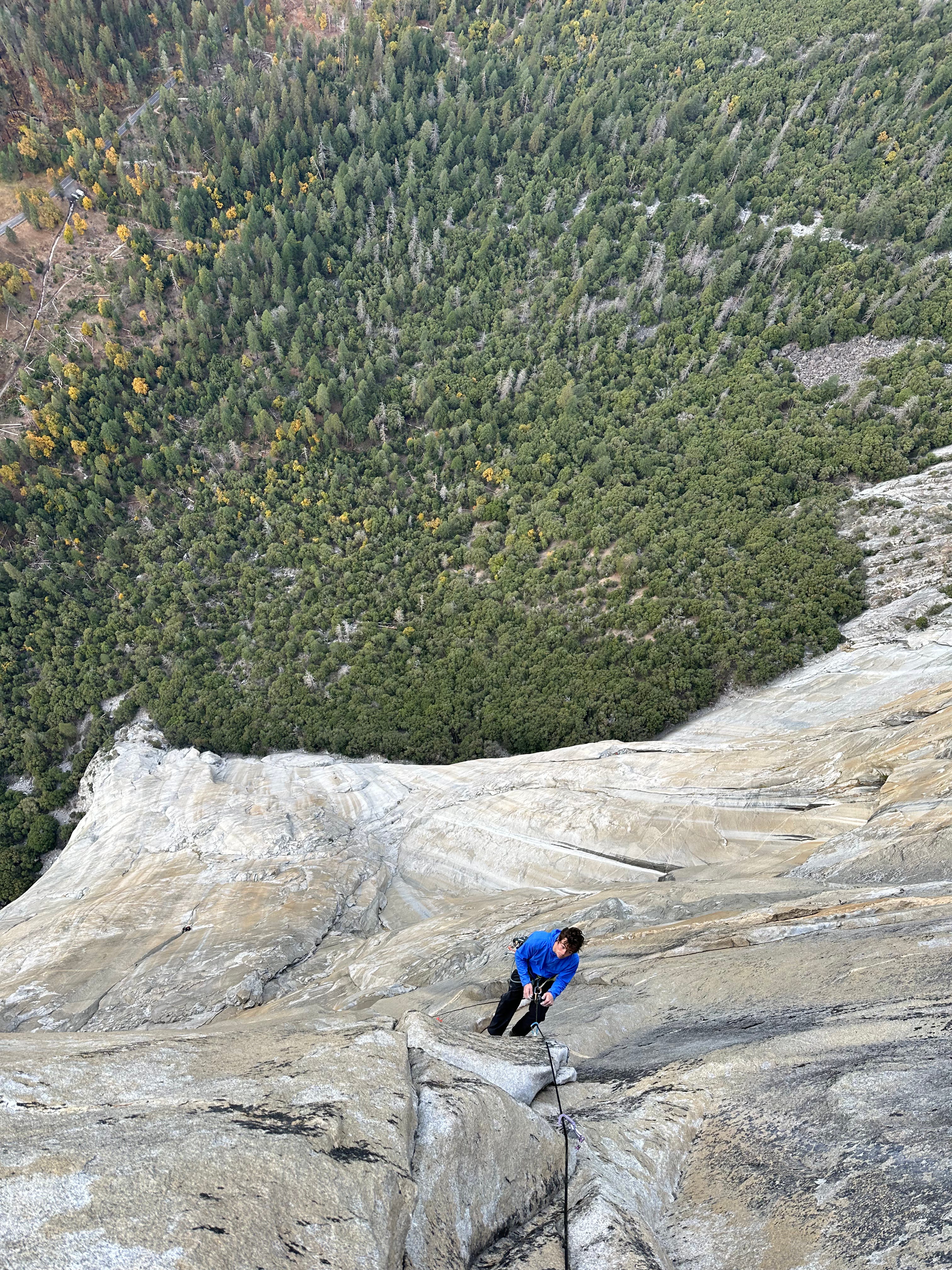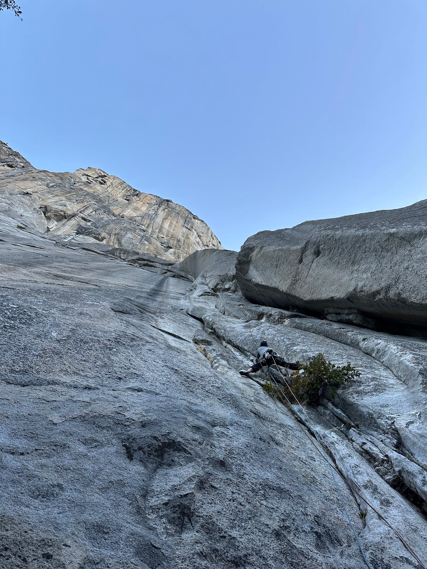 So far, Sam and I have had 6 days on the route. On our first day, we climbed the first 10 pitches to Mammoth Ledge, then descended the fixed heart lines. This was my first time climbing on El Cap; the initial slabs are as slippery as everyone says, and it took me a while to get into things and feel comfortable. By the time we reached the 13c pitch, the wall was already in the sun. I figured out a sequence for the crux traverse, but it was a bit too hot for the nail crimping flakes and feet. After a few rest days, we hiked up the Eastern Ledges with 300m of rope for some top-down clowning. We spent two trips, one of two days and another of three, sussing out the upper pitches.